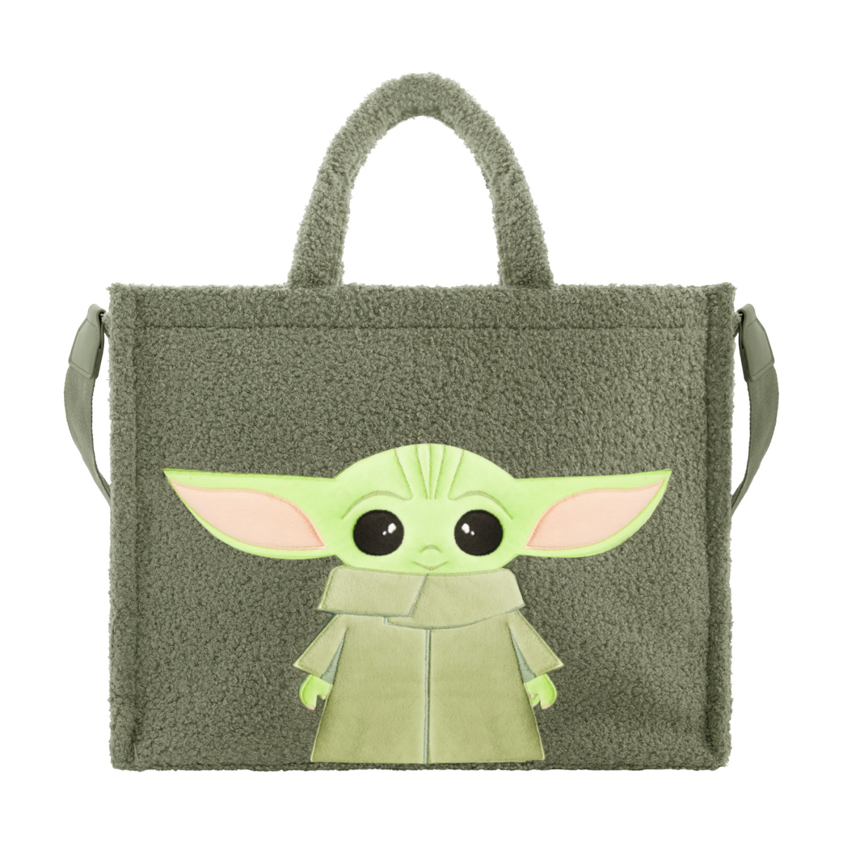 Bring the force with you wherever you go with this officially licensed Star Wars Grogu faux sherpa travel tote bag! Featuring the irresistibly cute Grogu (aka Baby Yoda) design, this plush olive green faux sherpa tote is both soft and spacious. Whether you're headed to the gym, on a weekend trip, or just out for errands, this tote is the perfect blend of style and fandom. Carry your love for Grogu and the Star Wars universe wherever you go with this fun and functional sherpa tote! Perfect for fans of all ages.
